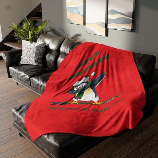 Happy Holidays Christmas on Island Time Penguin Surfing Fleece Throw Blanket